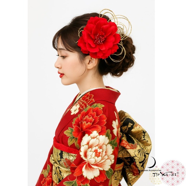 日本の伝統的な牡丹の花髪飾り、ゴーツドリボン付きの国産髪飾りです。 大人エレガントなデザインが、成人式、結婚式、卒業式などの特別な場面にぴったりです。 華やかさを引き立てるダイヤレーンも付いています。 この髪飾りは、職人がお花から一つ一つ手作りしており、その美しい技術と生地の質感には定評があります。 心を込めて作られた国産の品質を、ぜひご堪能ください。 この髪飾りを身に着けることで、あなたのヘアスタイルが一層上品で華やかに輝き、周りの人々からも注目されること間違いなしです。 特別な日を彩る一つのアクセサリーとして、ぜひお手元にお迎えください。