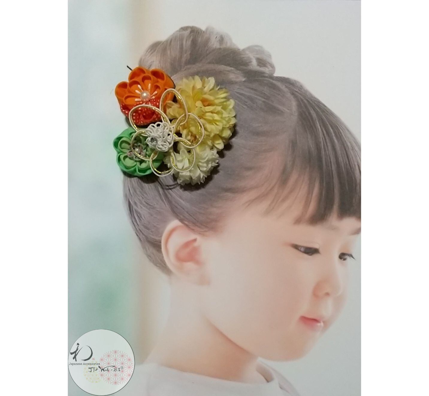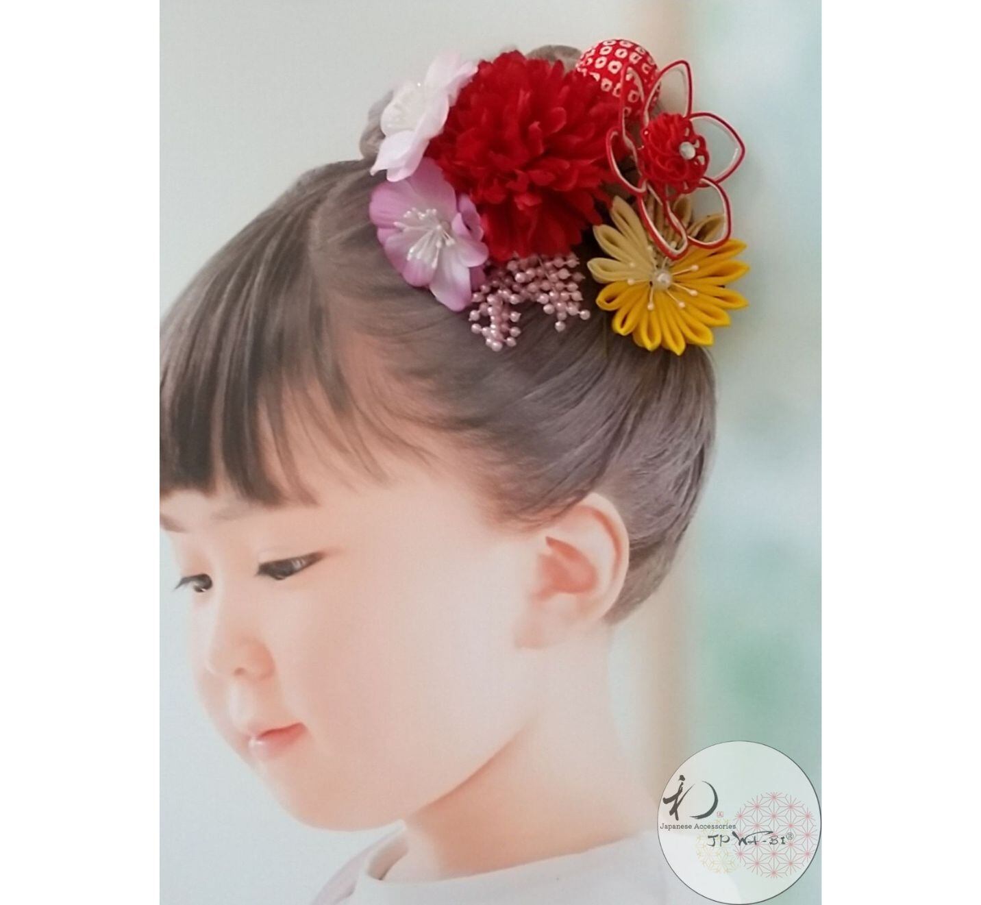 アーティフィシャルフラワー、華やかな水引花、つまみ細工花が美しく組み合わさり、お子様の髪型を華やかに演出します。