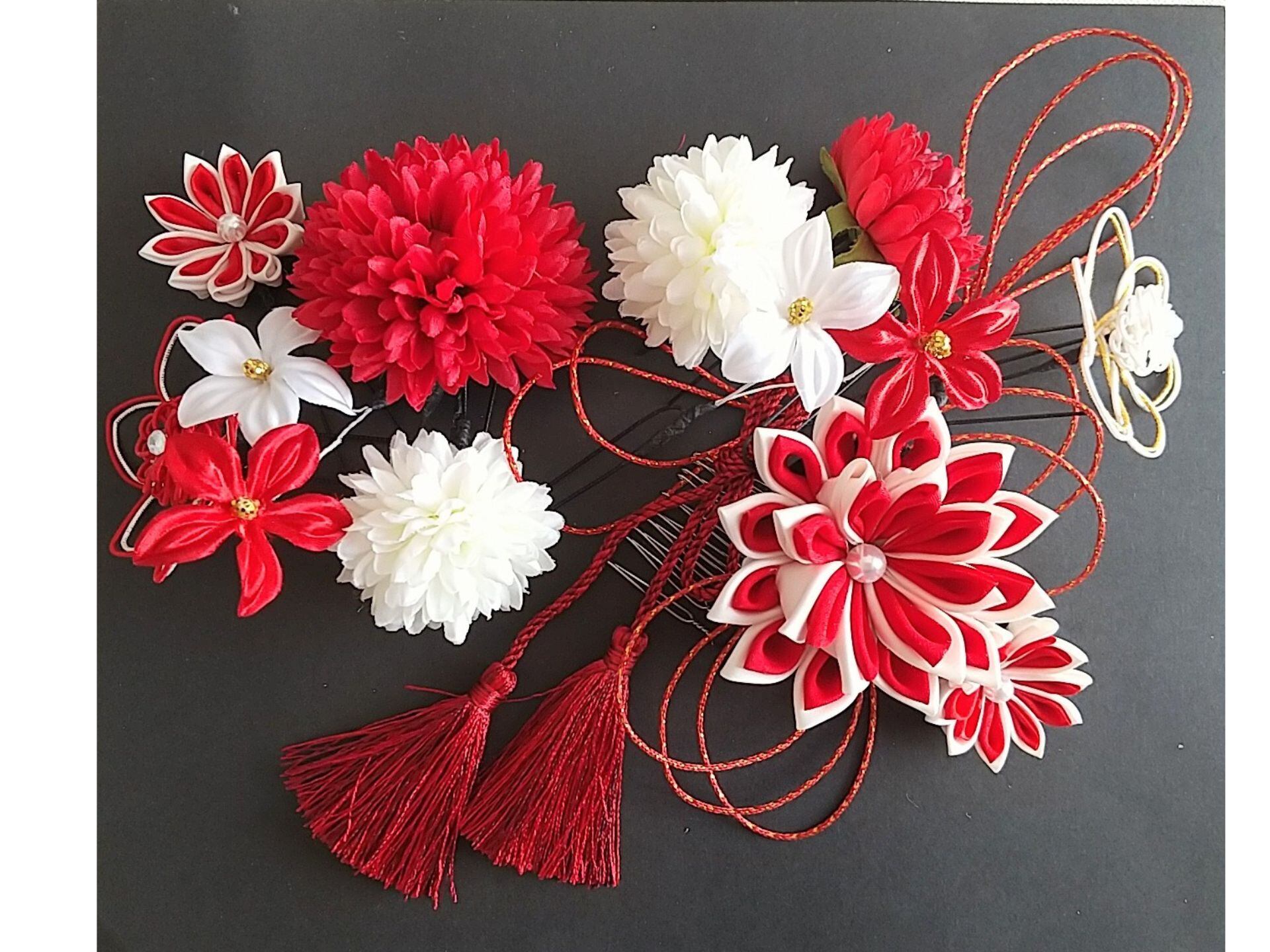 - **華やかなデザイン**: 繊細なつまみ細工、水引、タッセルが織りなす華やかなデザインは、特別な日にぴったり。色彩豊かな飾りが際立ち、あなたの魅力を引き立てます。