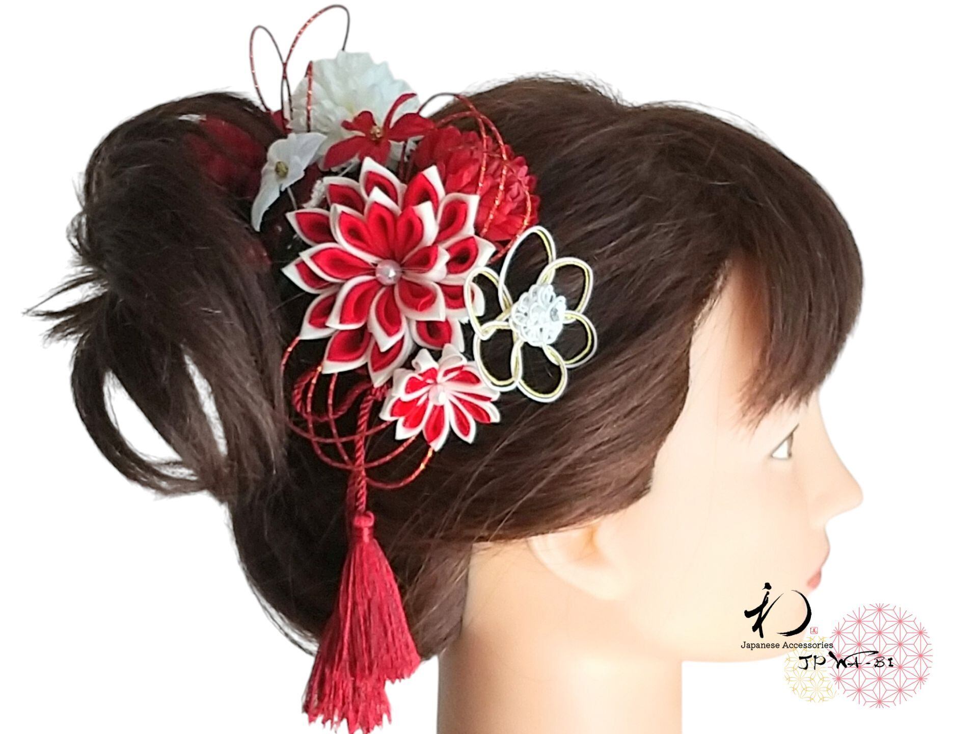 美しいつまみ細工や水引、アーティフィシャルフラワーが繊細に組み合わさり、髪型を一層引き立てることでしょう。