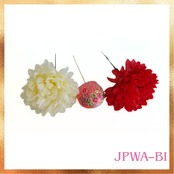 上品な白い花、鮮やかな赤い花、そして和風の生地で作られた可愛らしい玉飾りが、どんな着物や袴とも相性抜群です。