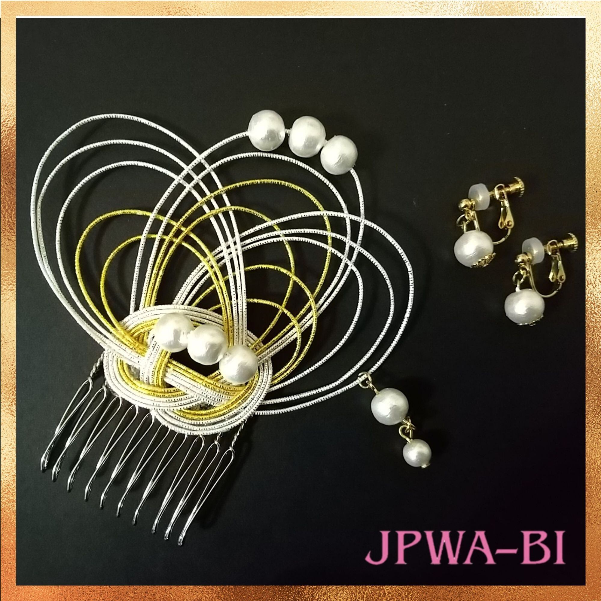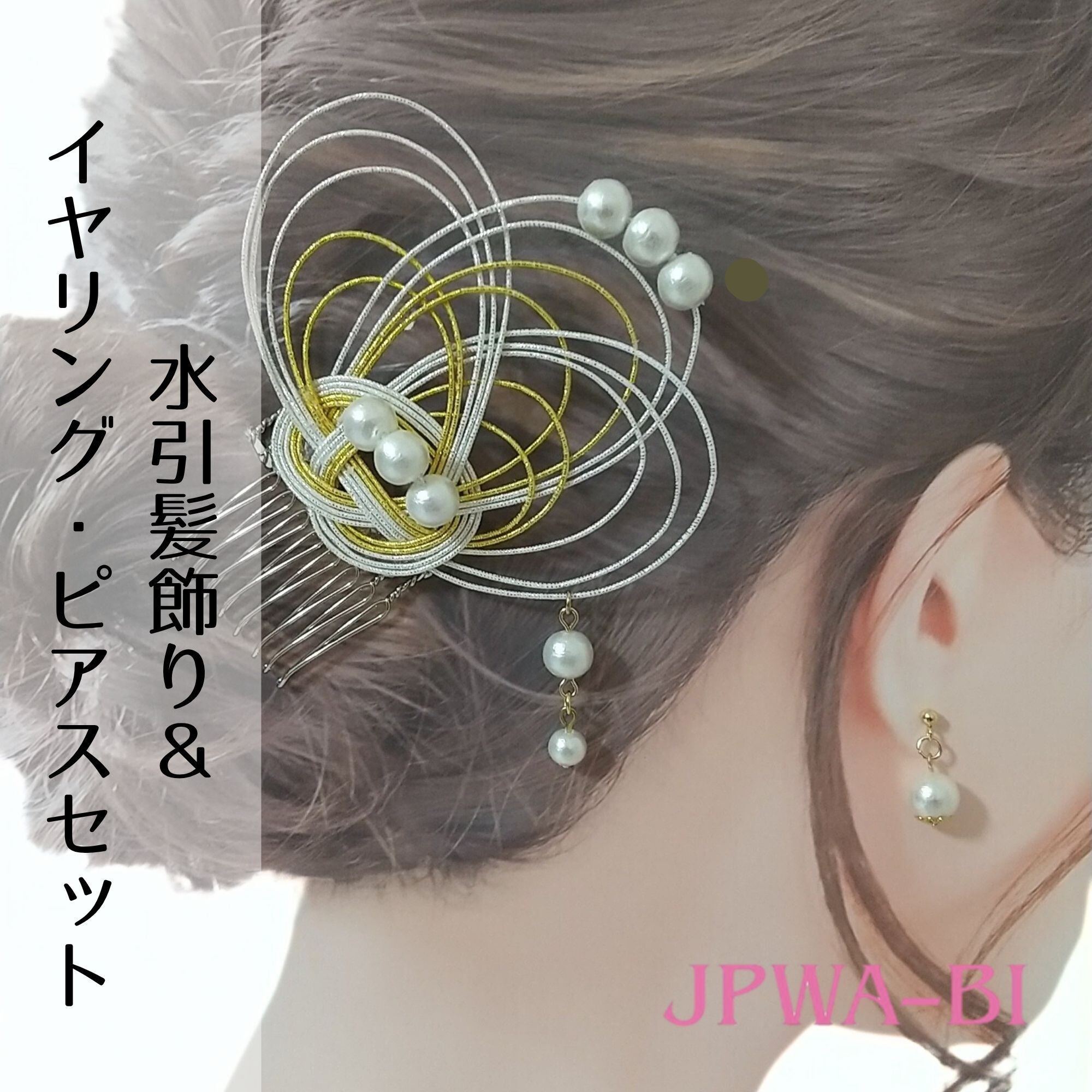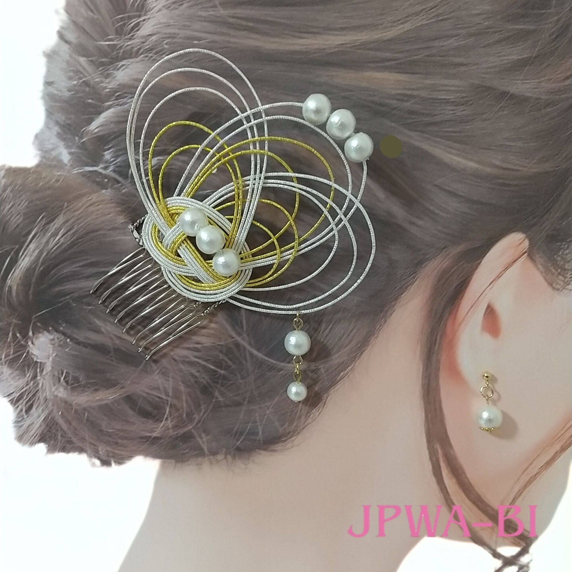 和洋折衷型の国産水引髪飾り・簪とペアのピアスorイヤリングのセット商品。