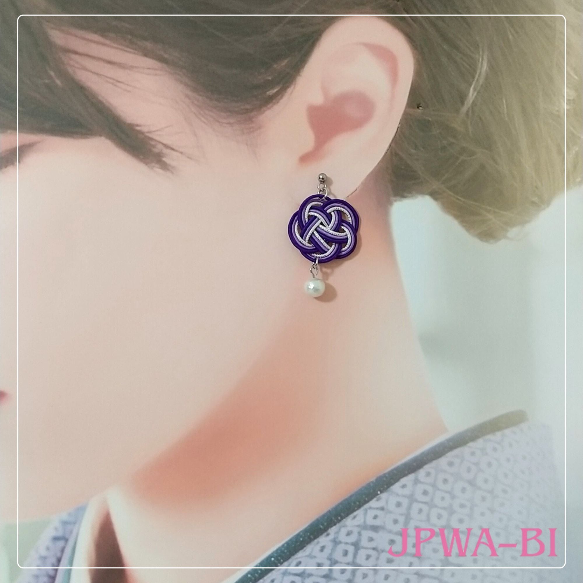和洋折衷 水引イヤリング//金属アレルギーの人にも優しいサージカルステンレス使用/シルバー金具/軽量/耳が痛くならないシリコンゴム付/浴衣・着物・袴・ドレス・普段使い/成人式・結婚式・卒業式/3色展開