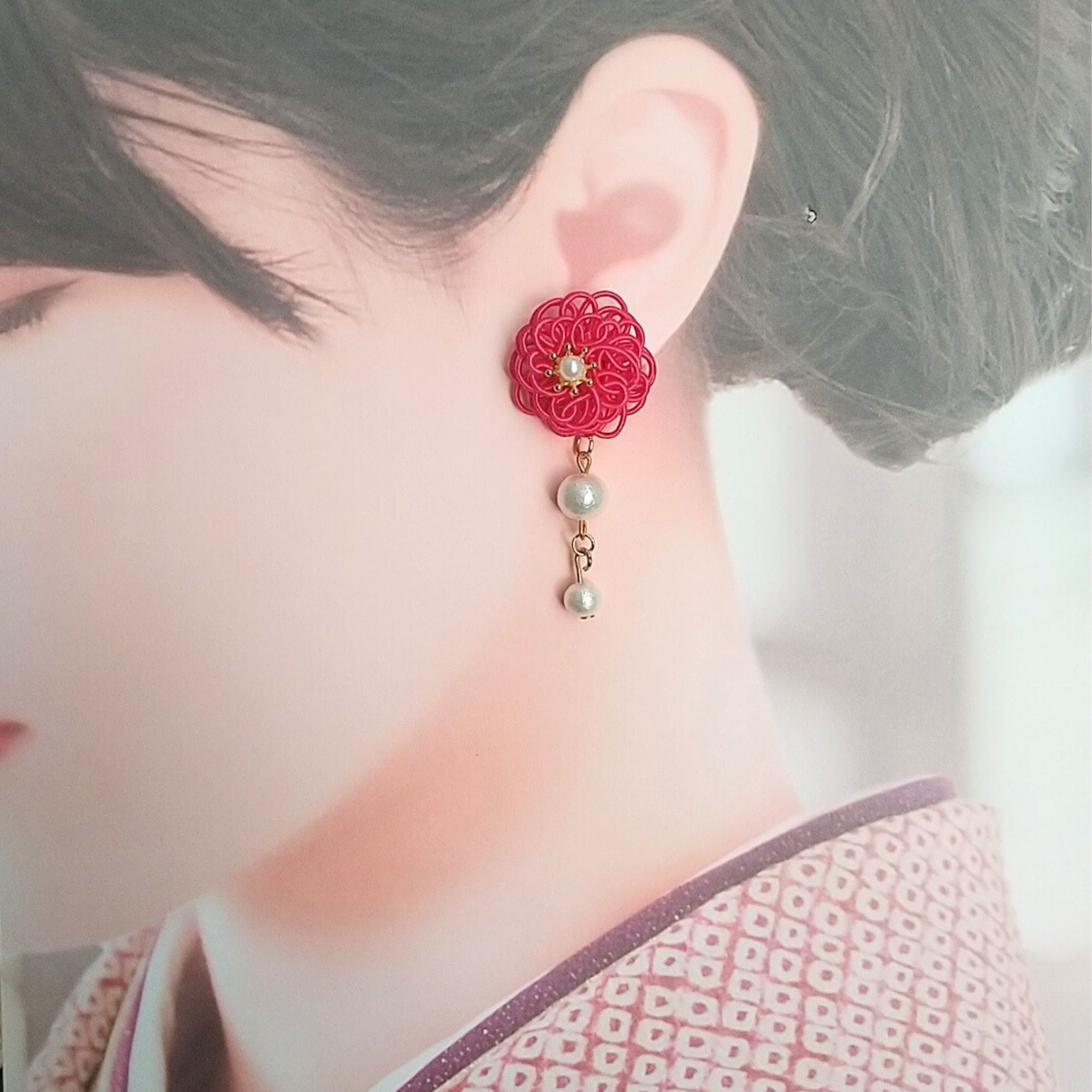 華やかさと上品さを兼ね備えたこのイヤリングは、浴衣や着物、袴に合わせても美しいスタイリングを生み出します。また、ドレスなどのあらたまった装いに合わせても、洗練された印象を与えてくれることでしょう。