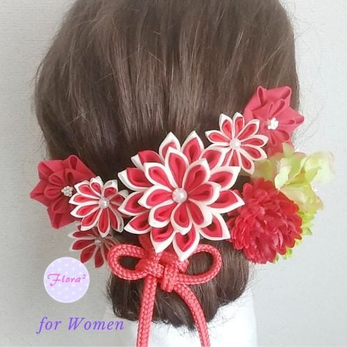 和装の華やかさを引き立てる髪飾りです。つまみ細工と造花を組み合わせた独自のデザインが特徴で、美しさと可愛らしさを兼ね備えています。成人式や結婚式などの特別なシーンでの髪装いに最適です。