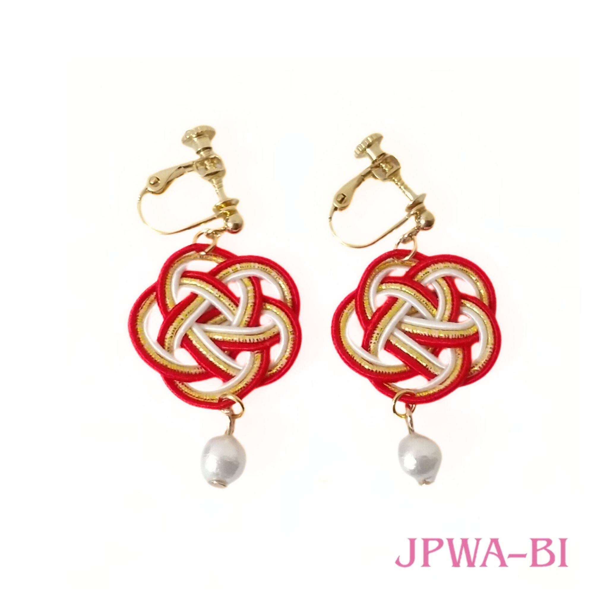 和洋折衷 水引イヤリング//金属アレルギーの人にも優しいサージカルステンレス使用/ゴールド金具/軽量/耳が痛くならないシリコンゴム付/浴衣・着物・袴・ドレス・普段使い/成人式・結婚式・卒業式/2色展開