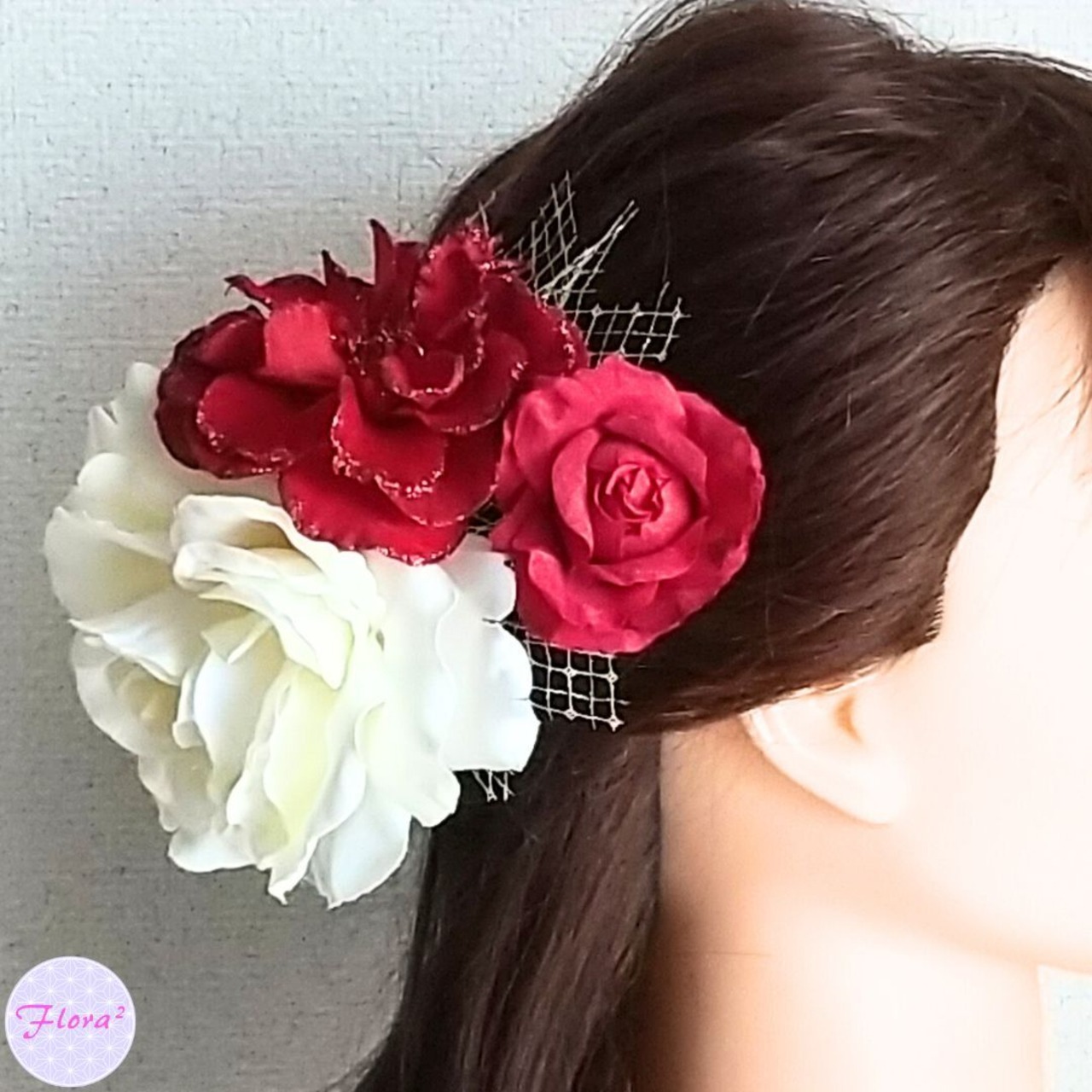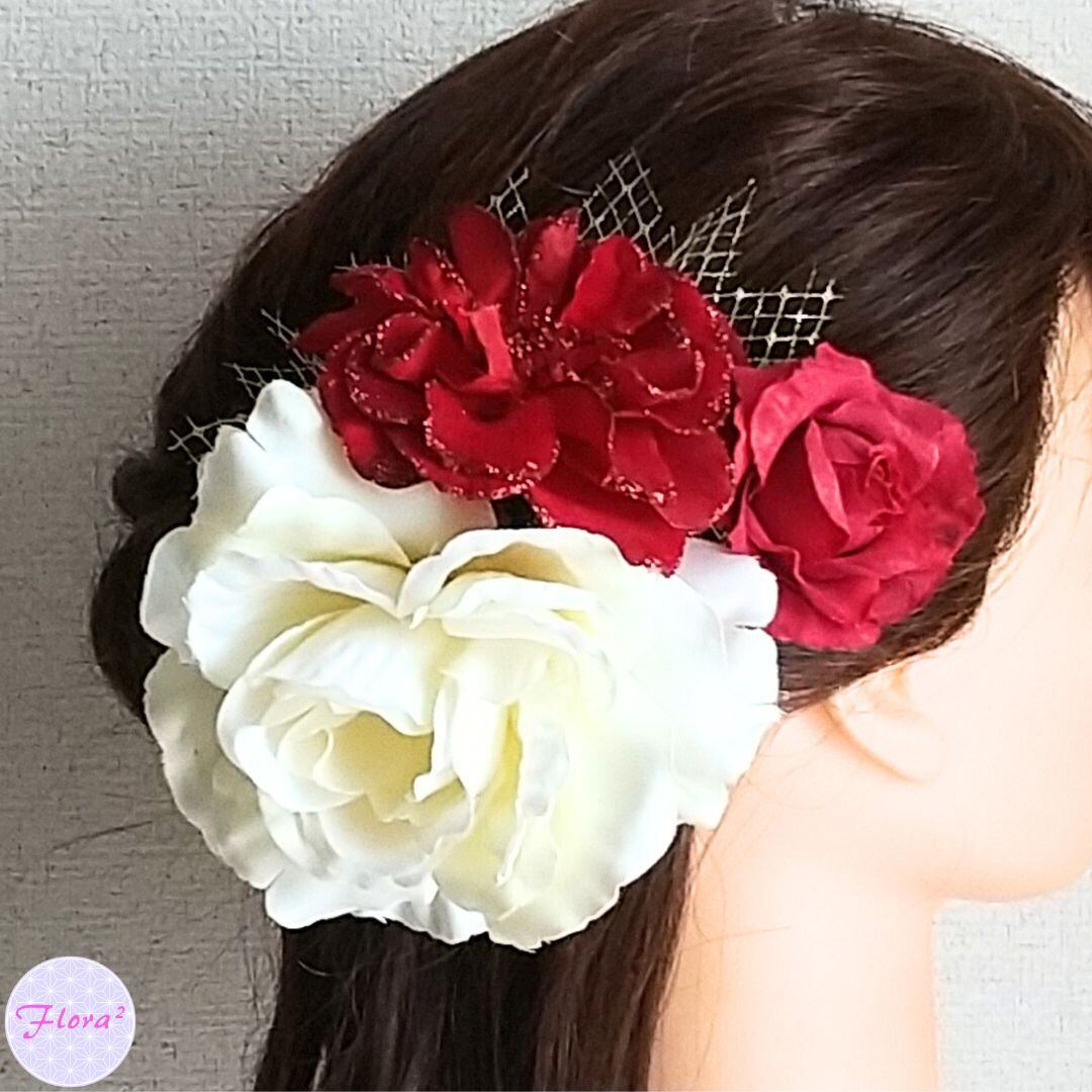 華やかな装いを完成させる、紅白のバラと花飾りの髪飾りです。