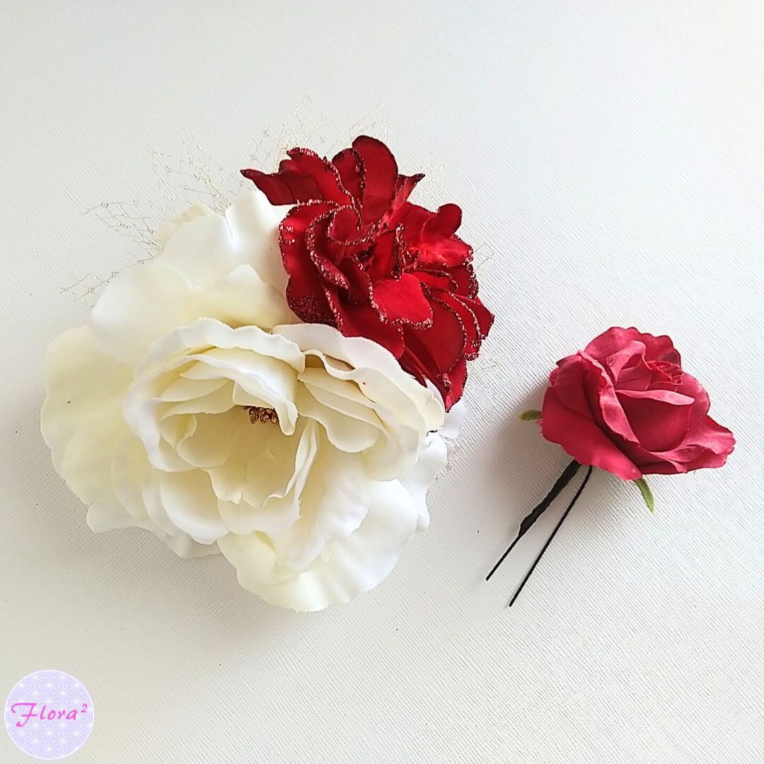 髪飾り//紅白のバラ・花飾り/ウエディング・成人式/ラメネット付/透明パッケージ入り
