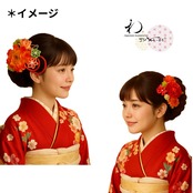 オレンジ系の髪飾りは希少性があり、日本の伝統的な技法であるつまみ細工とアーティフィシャルフラワーを組み合わせ、美しいデザインに仕上げました。