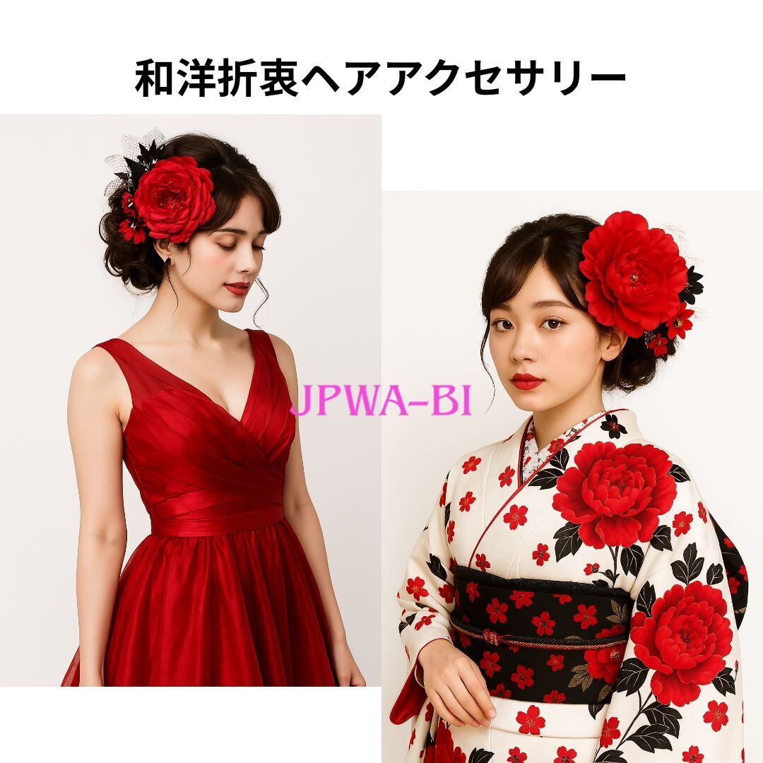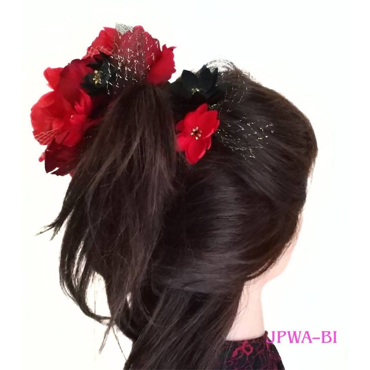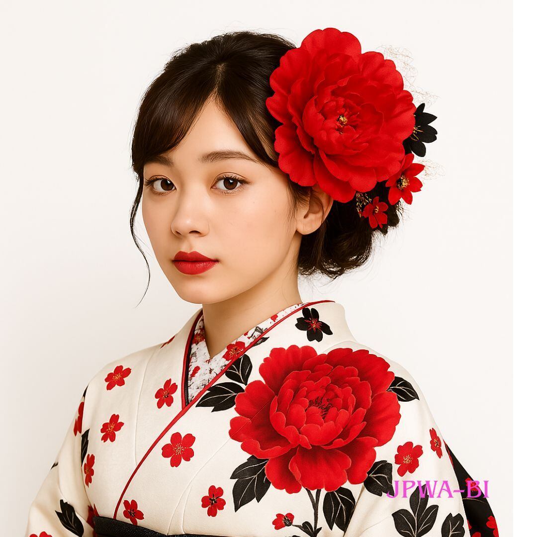 赤牡丹のエレガントなデザインの花飾りと小花のMIXで、着物やカラードレスとの相性も抜群です。結婚式や成人式など、特別な場面でのアクセントにぴったりです。