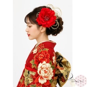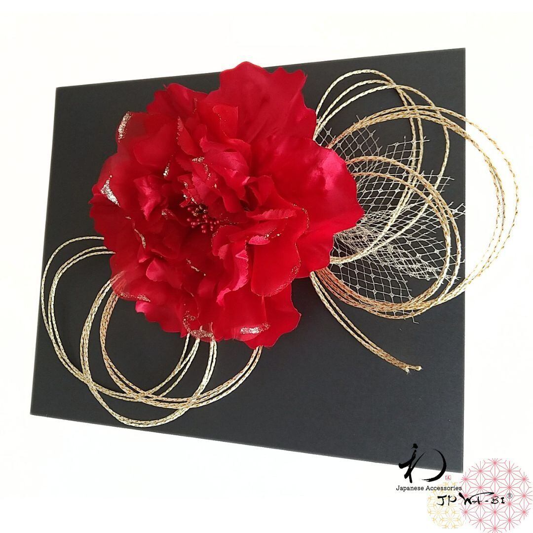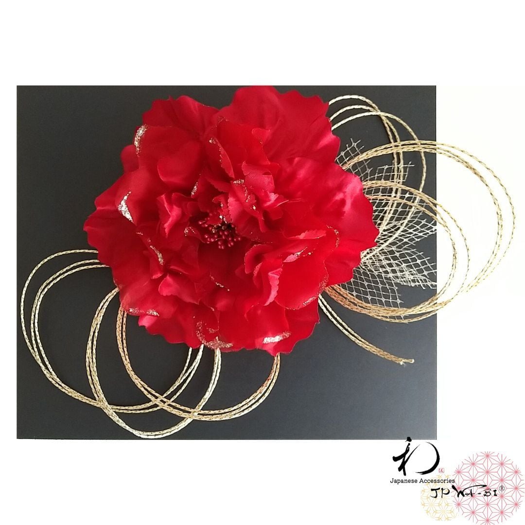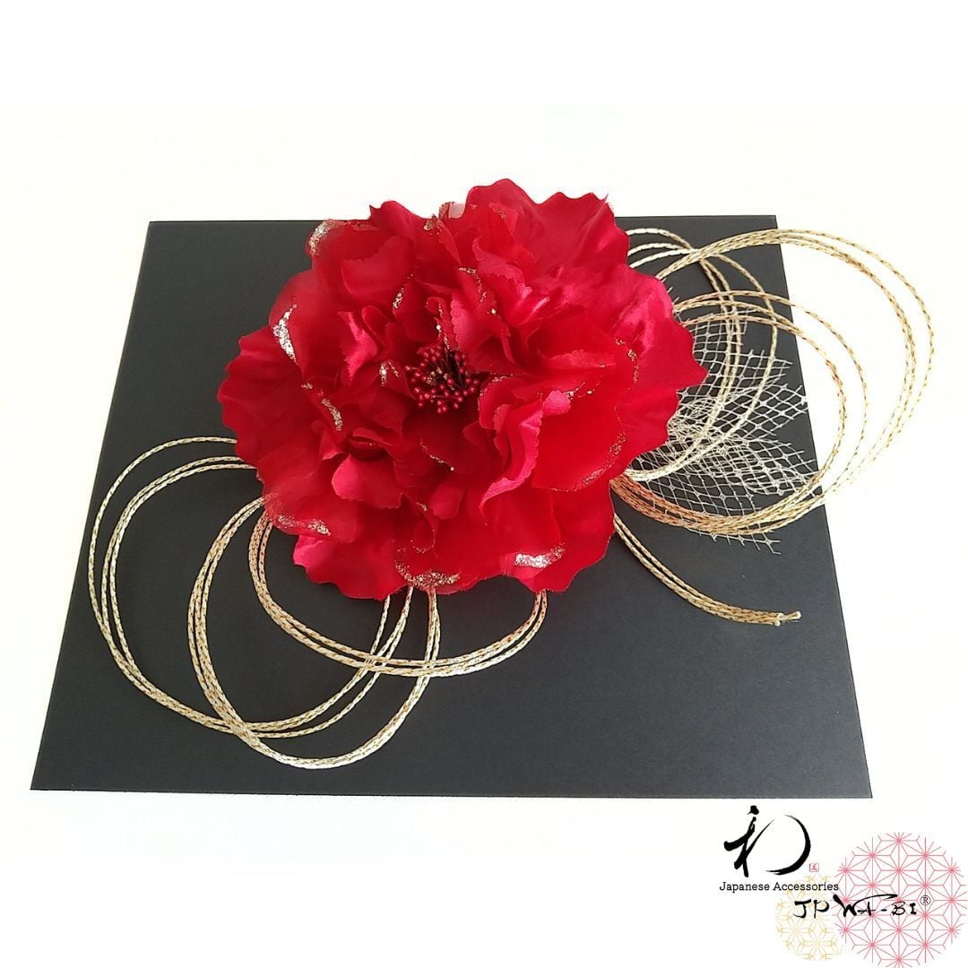 アーティフィシャルフラワーの牡丹の花と大胆にデザインされた水引で豪華で華やかな装いにぴったりの髪飾りです。