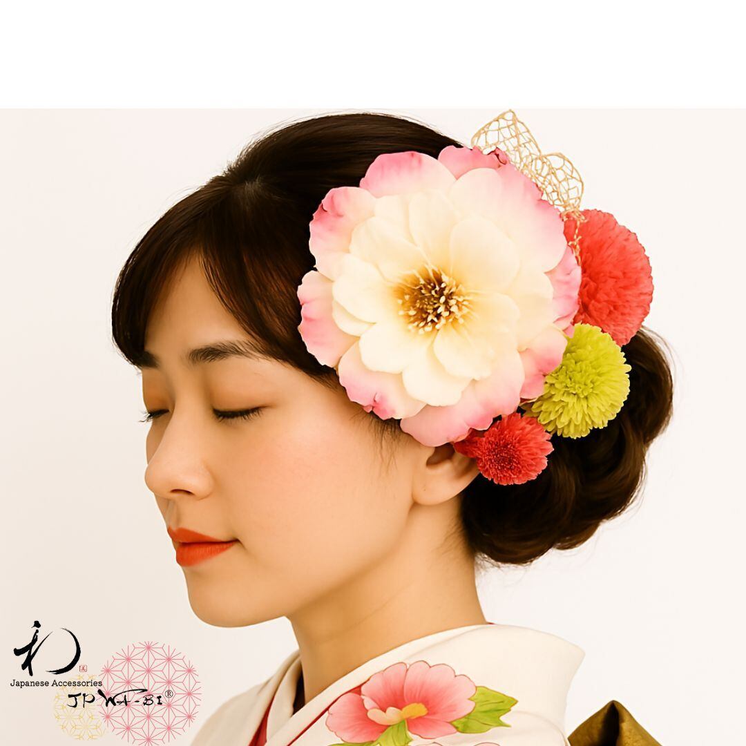 夢と希望を象徴する花々が、日本の美しい文化を織り交ぜながら、あなたの美しさを引き立てます。この髪飾りで、大切な日の素晴らしい思い出を彩ってください。