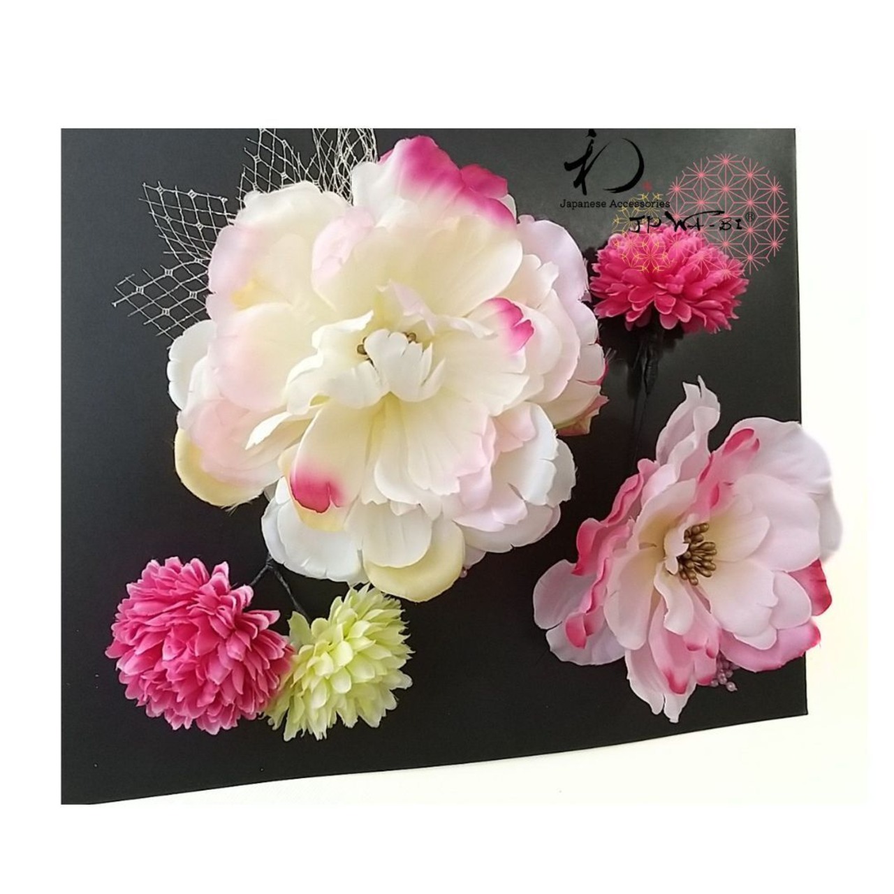 アイテム:大きい方の牡丹の花飾りはコーム付き、その他の花飾にはそれぞれ独立したUピンが付いています。