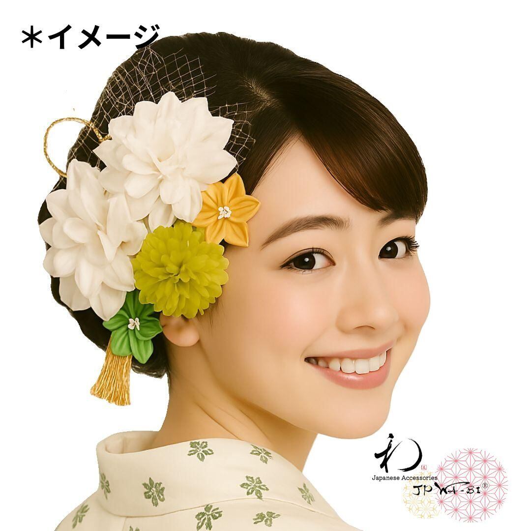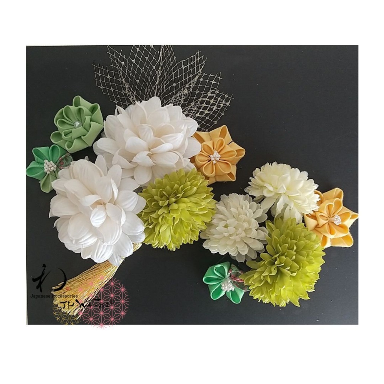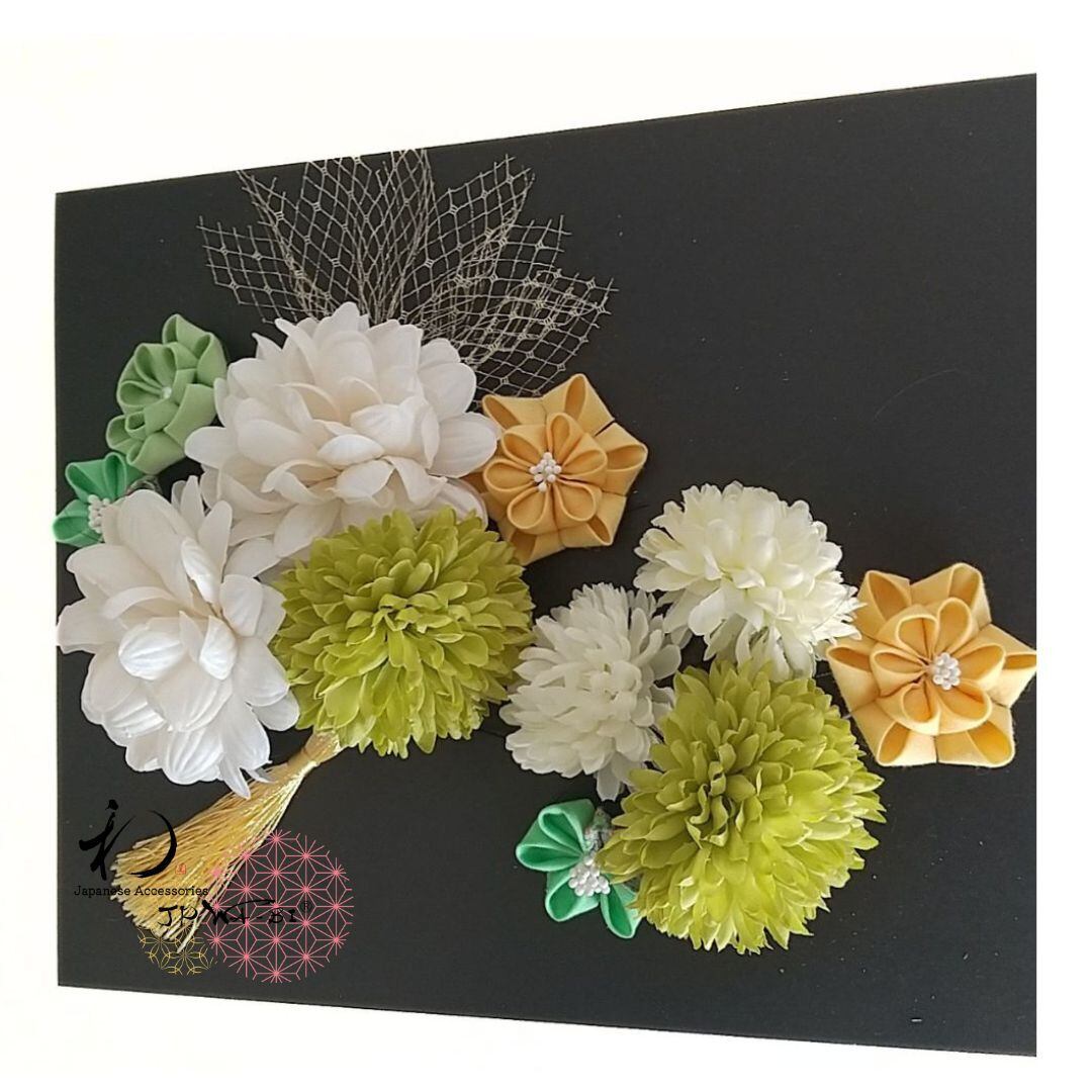 白を基調にしたお着物に合わせて、調和を保つ緑、そしてアクセントに色相の近い黄色を加えることで全体的にしっくりまとまった印象を感じさせる髪飾りです。