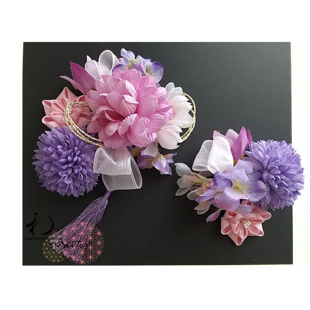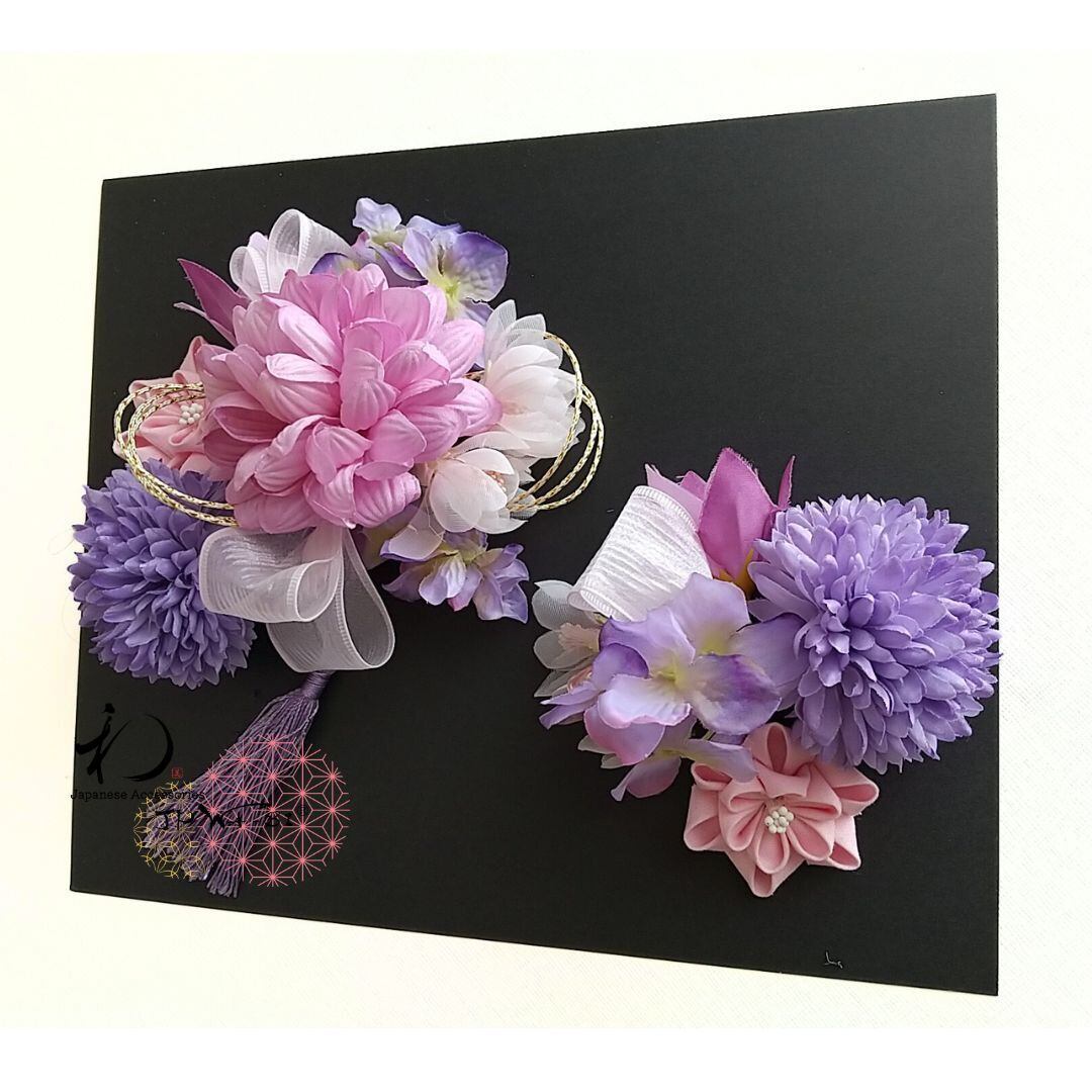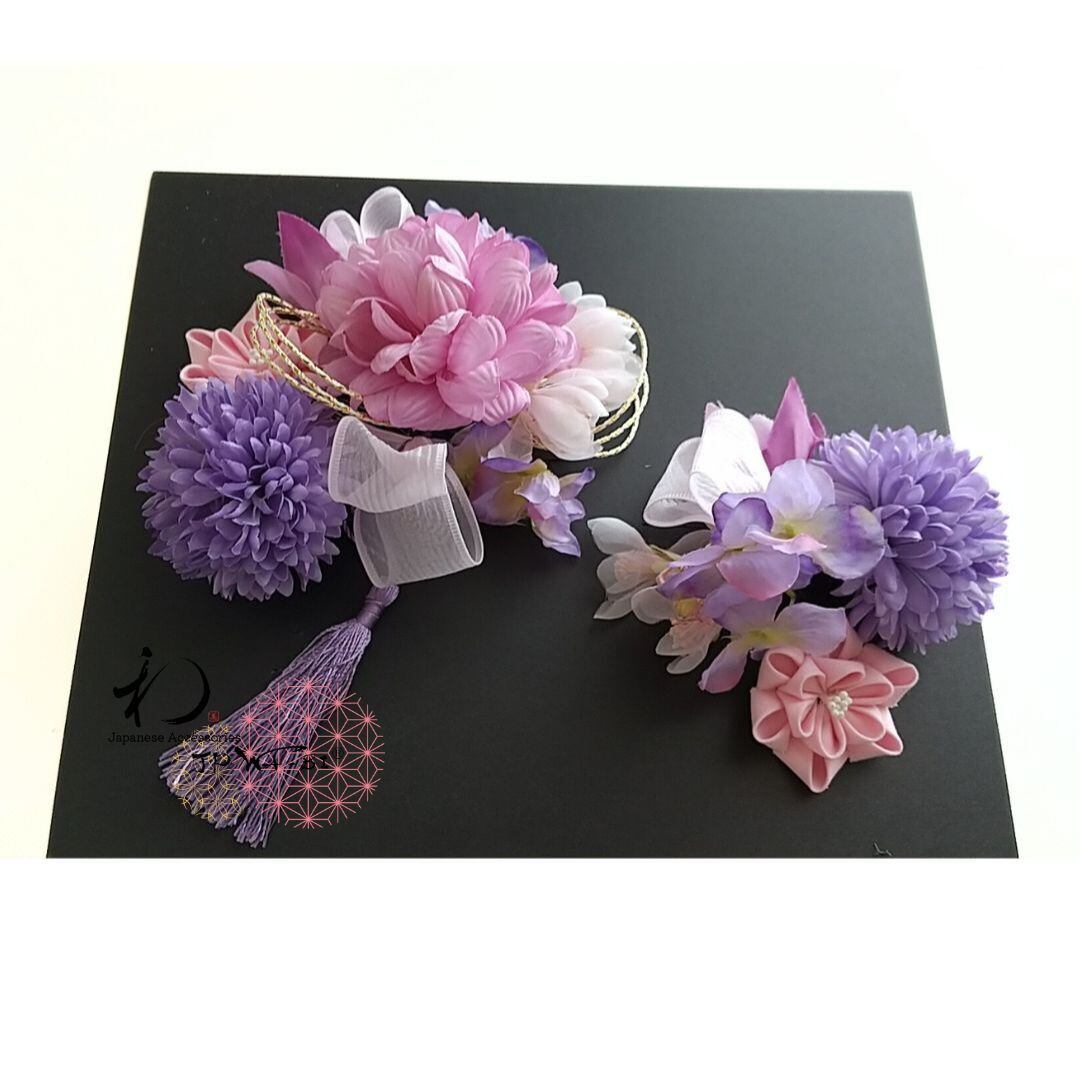 薄紫とピンク系でコーディネートされた髪飾りで、