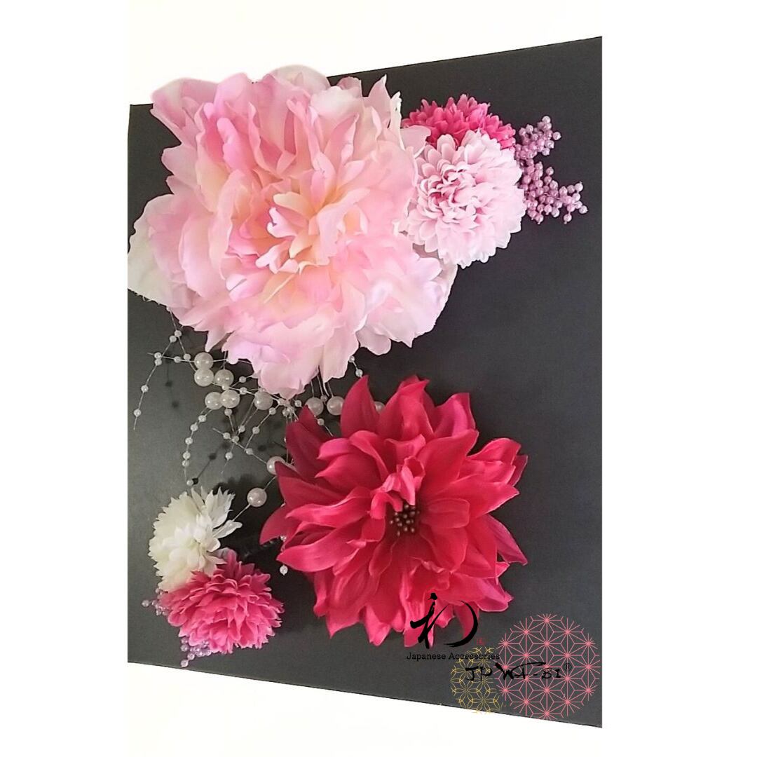 芍薬やピンポンマムなどのアーティフィシャルフラワーととパールレーンが華やかさをプラスした、国産の髪飾り。