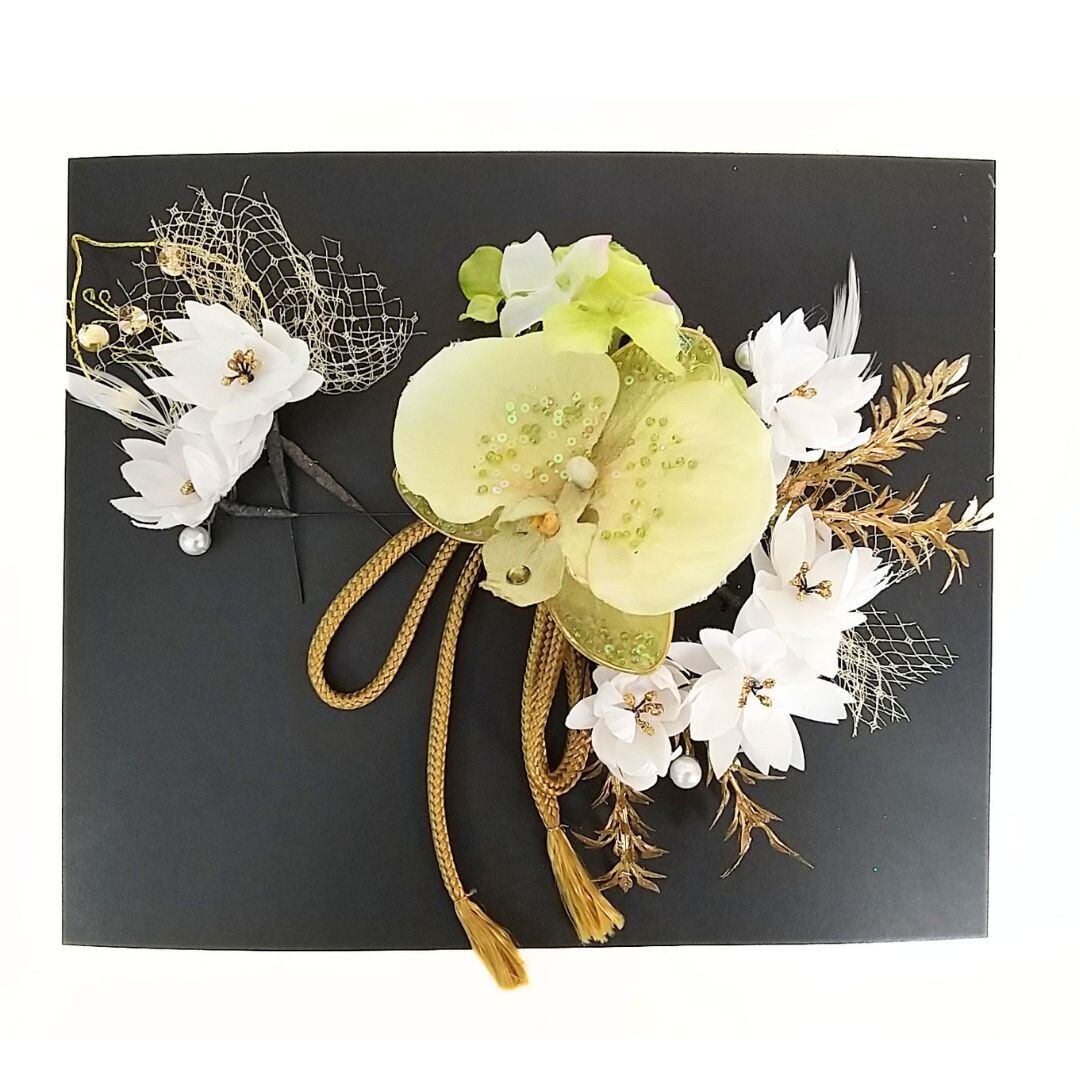 白を基調にグリーンをコーディネートした、結婚式や成人式や卒業式の袴などに、シンプルで飾らないものが好きな方におススメの髪飾り。
