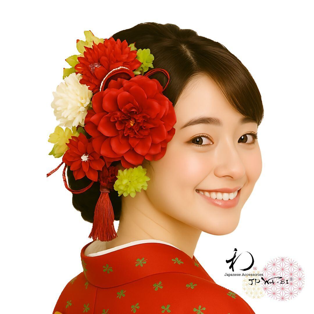 送料無料!!//国産髪飾り/成人式・卒業式・結婚式/着物・袴・色打掛髪飾り/つまみ細工×アーティフィッシャルフラワー/水引・タッセル付/透明パッケージ入り | 和洋折衷アクセサリー ・小物をプロデュース するジェイピーワビ