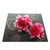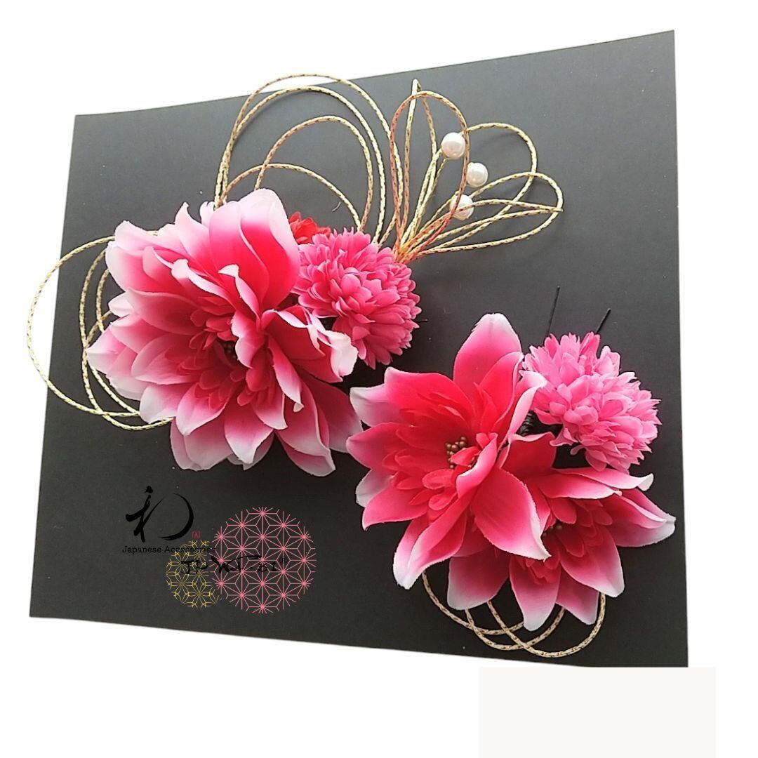豪華にあしらった水引細工がヘアスタイルを引き立て、華やかな雰囲気を演出します。