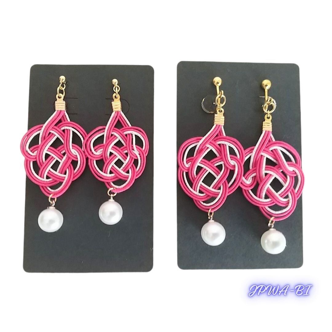 水引イヤリング//金属アレルギーの人にも優しいサージカルステンレス使用/和洋折衷アクセサリー/ビビットピンク×シルバー/袋入り