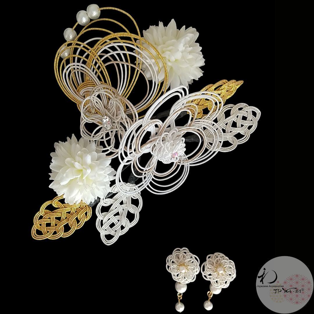 国産髪飾り9点入り//水引髪飾り&アーティフィッシャルフラワー/成人式・結婚式・卒業式/シルバー×ゴールド/箱入り